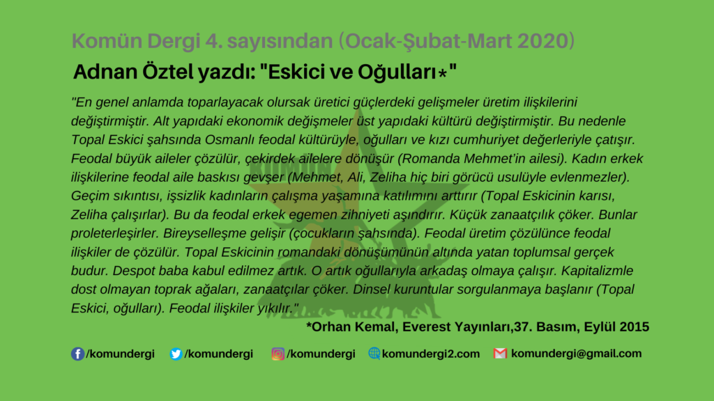 Orhan Kemal’in “Eskici ve Oğulları” romanında tek tek olgular değil toplumsal yapı bütünsel olarak çözümlenmiştir. Tarihsel arka plan da çok önemli olduğundan ben de toplumsal çözümlemeye estetik ölçüleri aşan düzeyde eğilmek zorunda kaldım. Bu bir zorunluluktu. Bu yaklaşımın Orhan Kemal romanlarını okurken yol gösterici olacağına inanıyorum.
